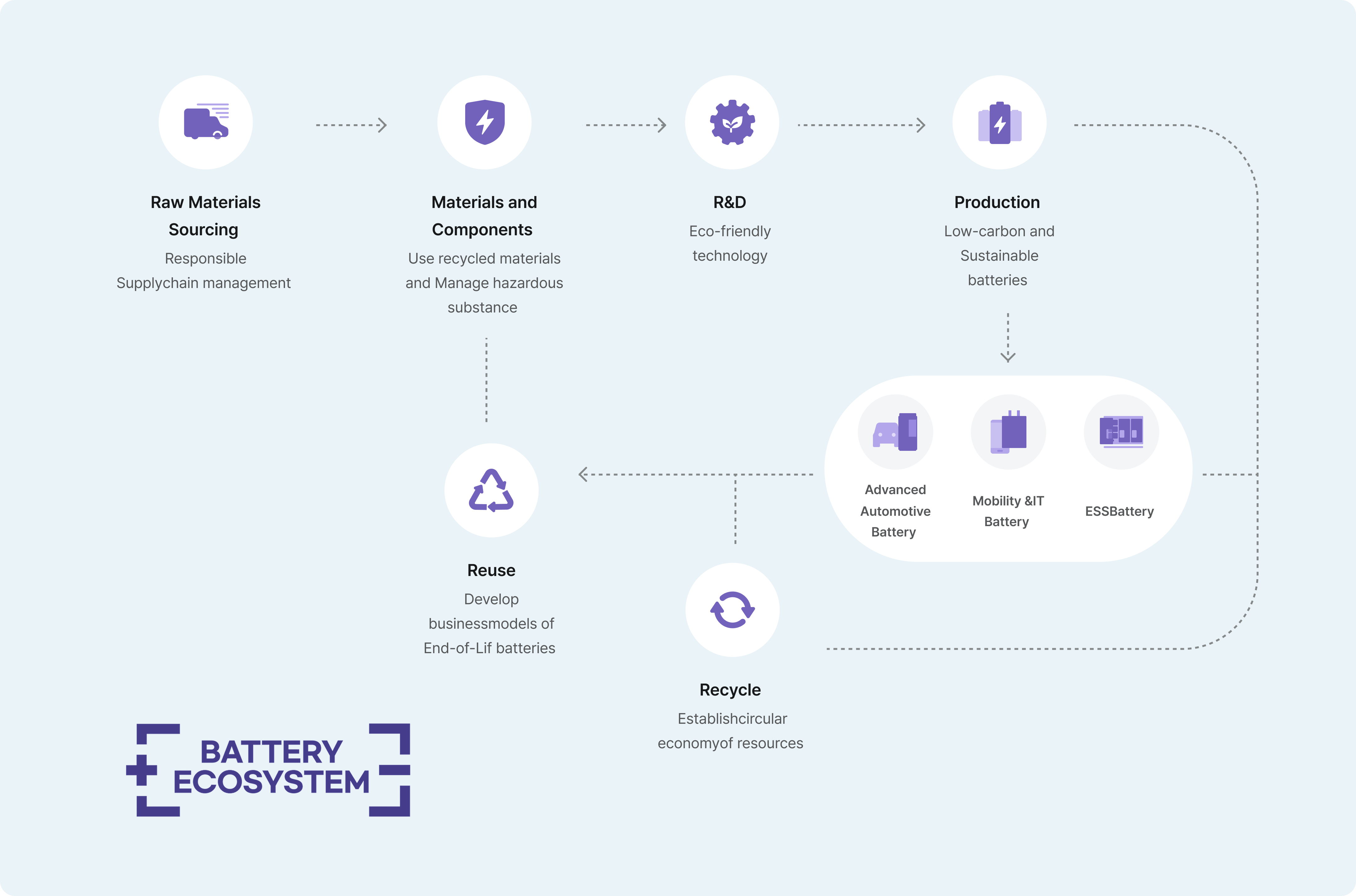 To comply with these emerging regulations, we are building the closed-loop resource circulation system that covers the entire value chain, from the production of raw materials for batteries to consumption, disposal, and recycling. In addition, we are collaborating with local partners to reuse and recycle End-of-Life batteries and recycle process scrap that meets global environmental standards.