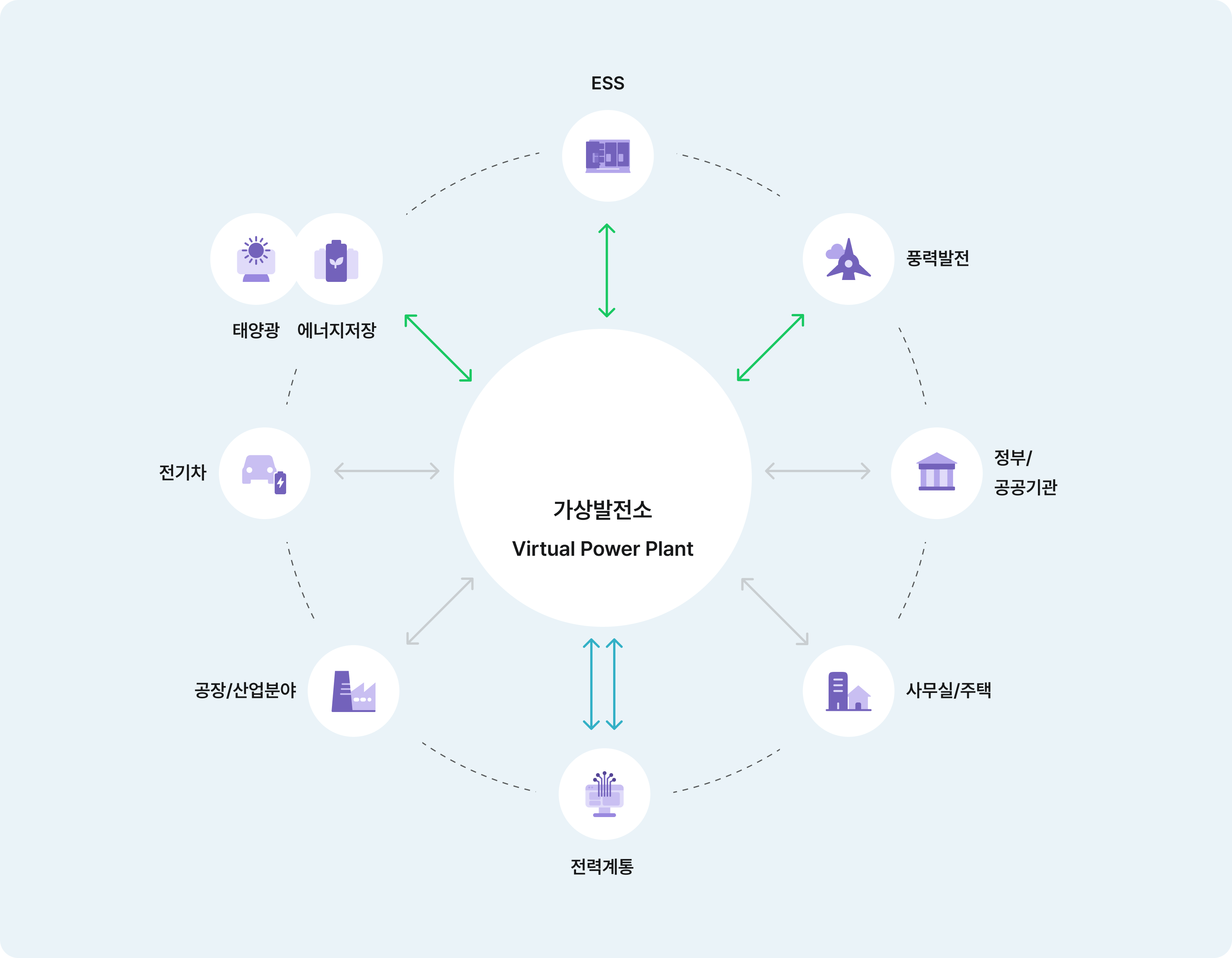 분산된 에너지 자원을 통합하여 하나의 발전소처럼 구성, 발전량 예측, 실시간 전력 거래, 계통 안정화 등 다양한 기능을 제공합니다.