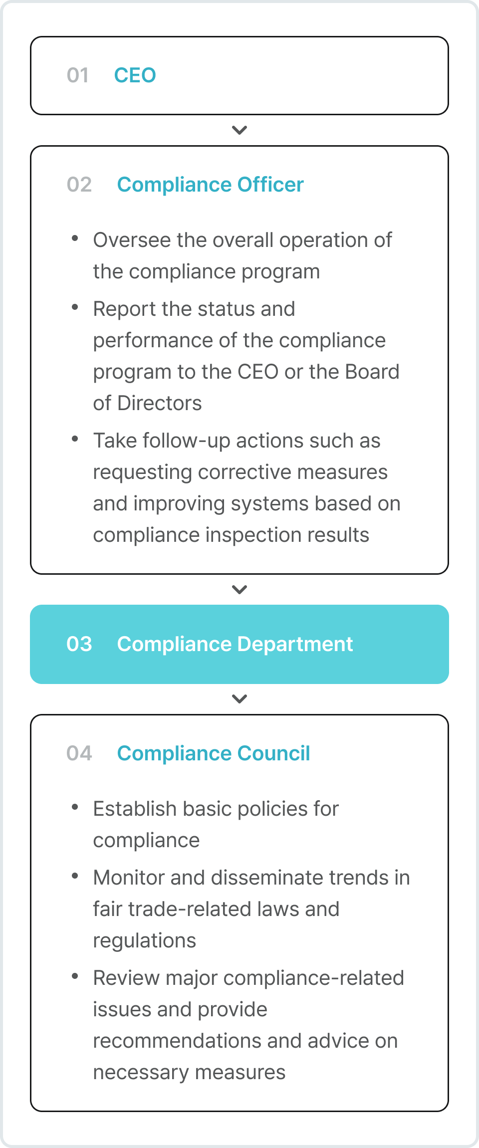 The Compliance Program (CP) is an internal compliance system established and operated by companies to proactively prevent violations of fair trade laws. It includes the CEO’s commitment to compliance, the designation of a compliance officer responsible for program operations, monitoring systems for detecting potential violations, fair trade compliance training, and the publication of a compliance program handbook.