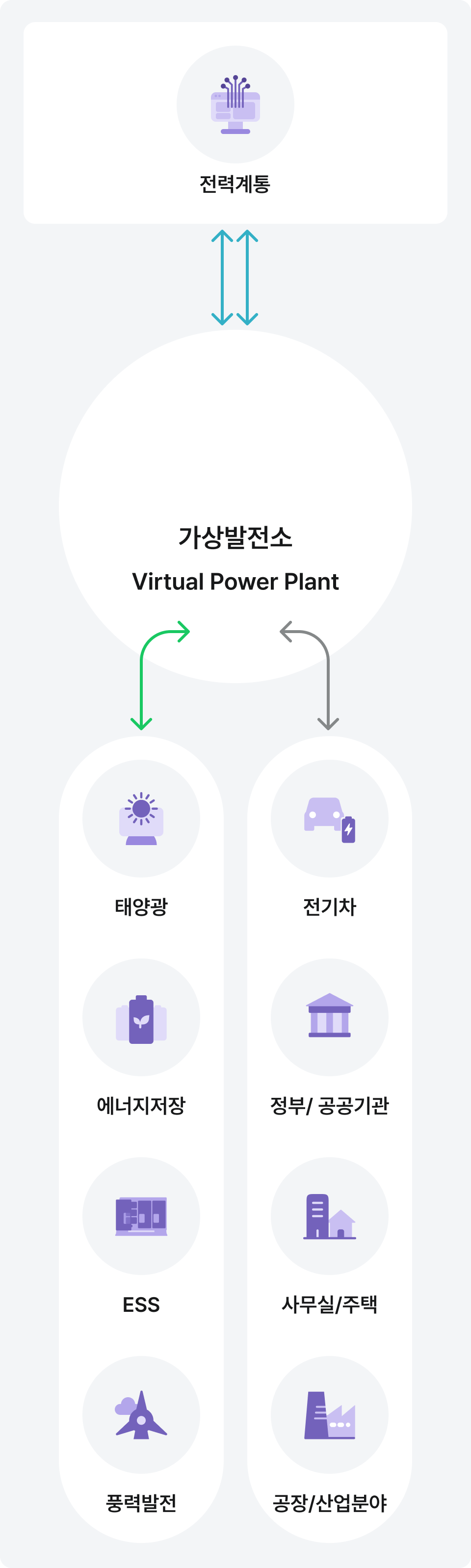 분산된 에너지 자원을 통합하여 하나의 발전소처럼 구성, 발전량 예측, 실시간 전력 거래, 계통 안정화 등 다양한 기능을 제공합니다.